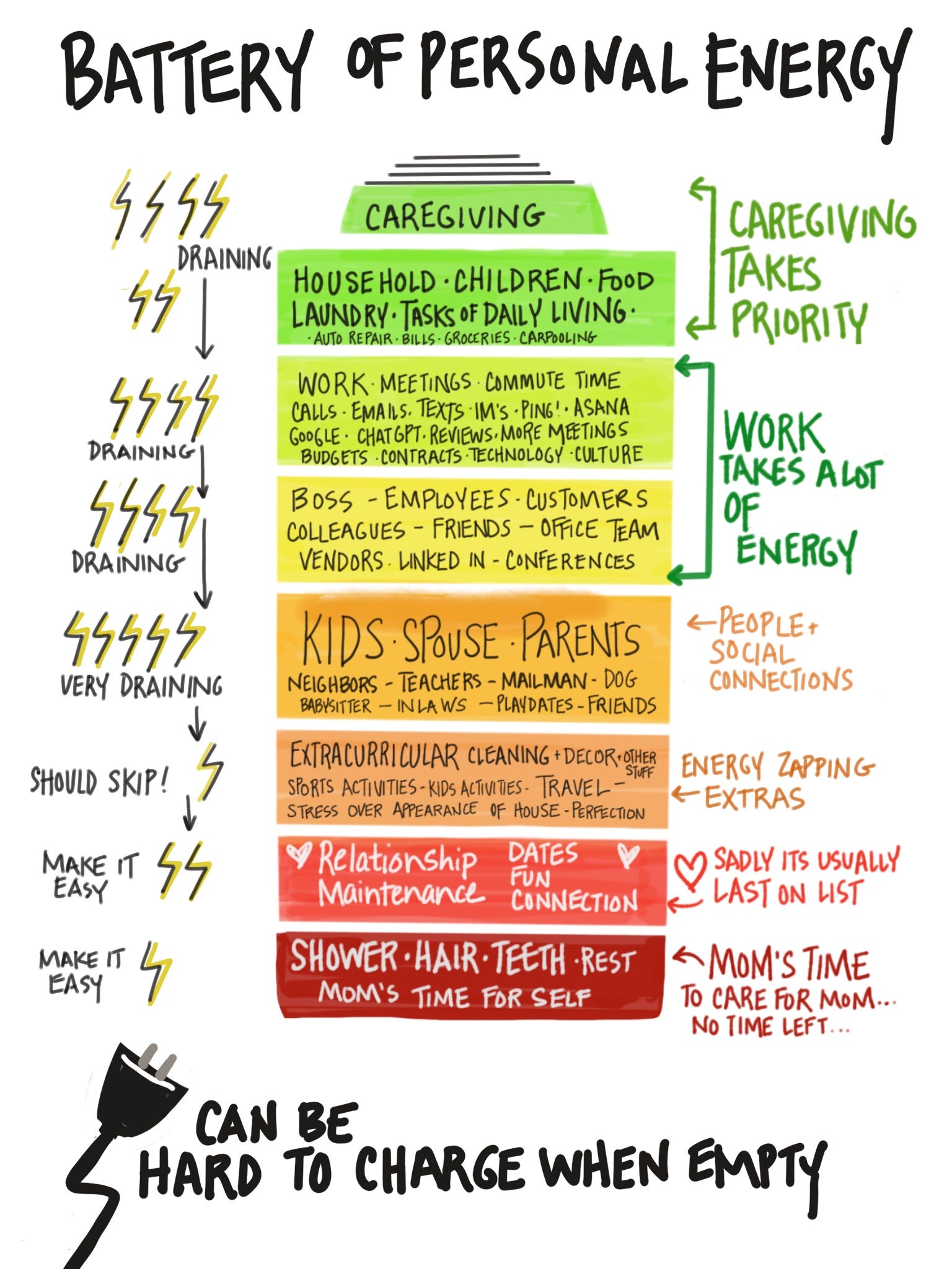 Afterward, I sketched this colorful battery visual to capture our insights. I hoped it would deepen her awareness, but I also made it as a reminder to myself that energy is a finite resource — and managing it requires mindful choices.