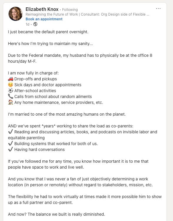 A woman shared how overnight she had become the default parent because her husband, a federal employee, was forced back to the office full-time. Gone was the flexibility that let them share the load. Now, she’s juggling drop-offs, sick days, school calls, activities, and home care tasks — alone.